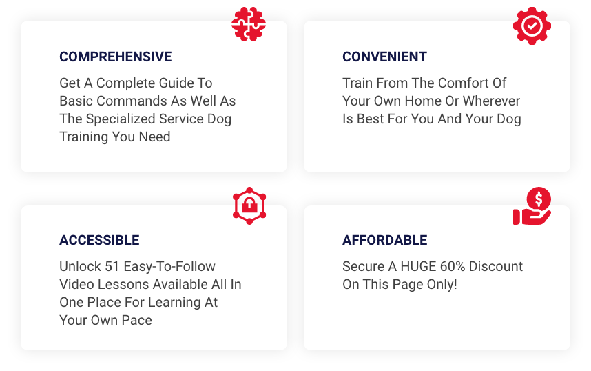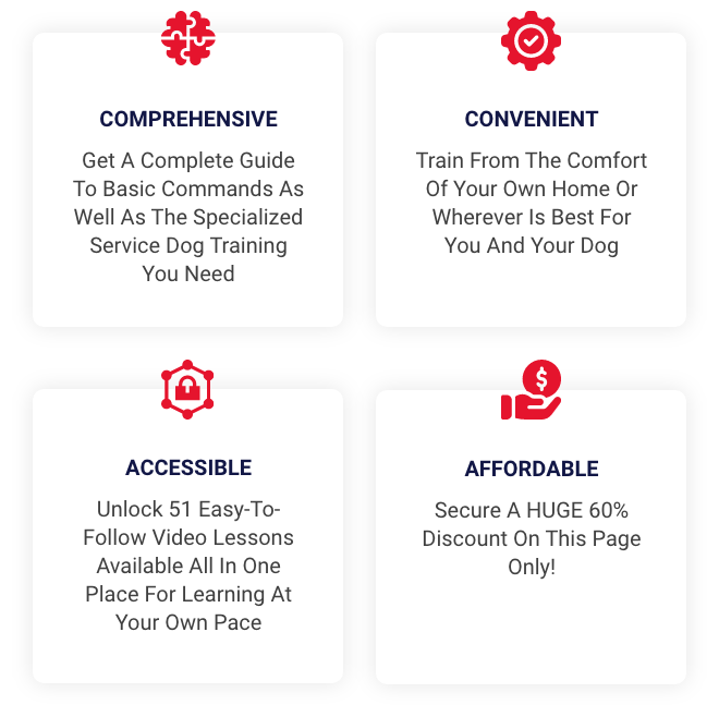 Overview Section 8 - Lesson 1: How To Know What To Teach Your Dog Section 8 - Lesson 2: Medication Reminders Section 8 - Lesson 3: Tactile Support Section 8 - Lesson 4: Provide Excuse To Leave Section 8 - Lesson 5: Deep Pressure Therapy (or DPT) Section 8 - Lesson 6: Reality Check Section 8 - Lesson 7: Detect Anxiety, Fear, or Flashbacks Section 8 - Lesson 8: Fetch Section 8 - Quiz